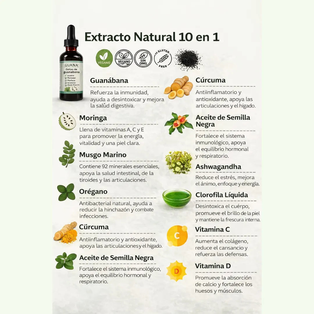 Gotas de extracto de guanábana 100% orgánico 10 en 1